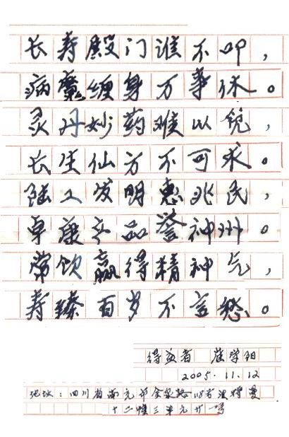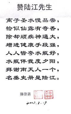 凡尊重中國古代養(yǎng)生智慧的患者,堅持“已饑方食”和定時主動補水者,均可祛病康復(fù)。如牡丹江醫(yī)學(xué)院87歲的張鵬圖飲用半年后高血壓未痊愈,陸江與他通話交流,了解他原先每日主食4兩,建議他用“已饑方食”減少主食肉食量,他理解后,將每日主食減為3兩,少吃兩塊肉,飲用一年治愈26年的冠心病和高血壓。他2003年5月31日來信說:“飲用卓康小分子團(tuán)水是根治高血壓、冠心病、糖尿病的一把金鑰匙,是填補醫(yī)學(xué)空白,為人類造福,應(yīng)推廣該產(chǎn)品?!?/strong>